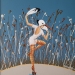 Sold Klein schilderij van een vogelvrouw (ooievaar) die waakt over haar domein.