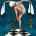 Schilderij van een vogelvrouw (ooievaar) in de wolken. Een tikje uitdagend maar o zo onschuldig.