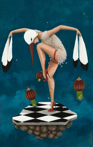Schilderij van een vogelvrouw (ooievaar) in de wolken. Een tikje uitdagend maar o zo onschuldig.